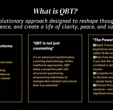 Discover how QBT (Question-Based Transformation) empowers individuals to reshape their thoughts, enhance emotional resilience, and unlock their full potential. Experience lasting change through guided questioning and cognitive restructuring, leading to clarity and confidence in your personal and professional life. Change your thoughts, transform your life!